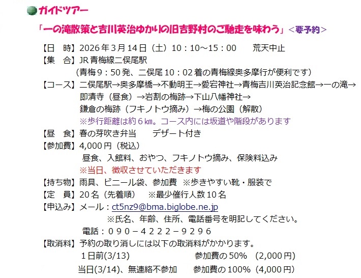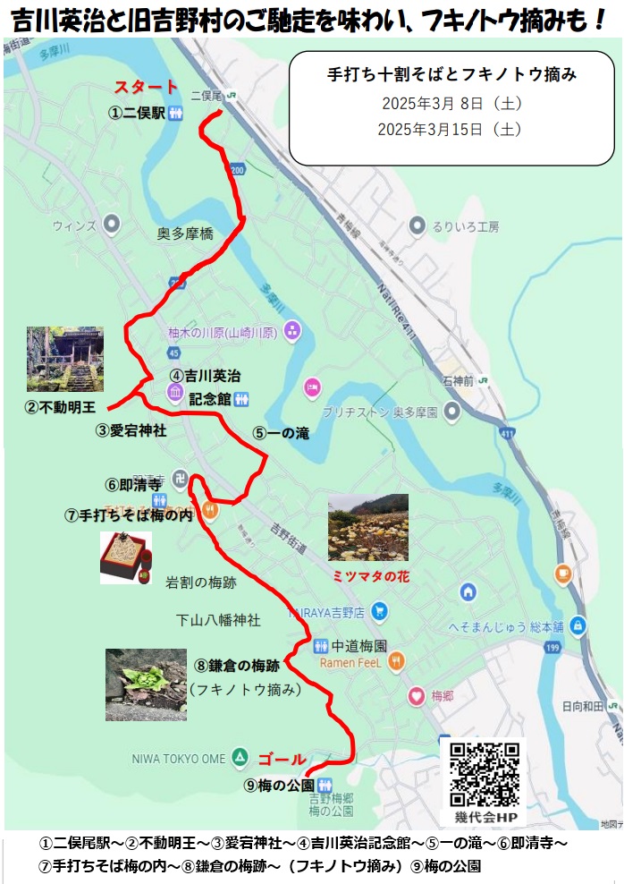 ガイドツアー、吉川英治を訪ねる。旧吉野村の手打ち十割そばに舌づつみ。 フキノトウ摘みも体験します…